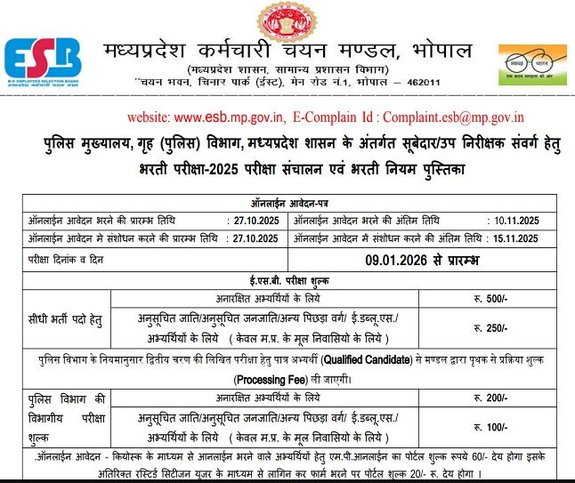 इच्छुक उम्मीदवार 27 अक्टूबर 2025 से 10 नवंबर 2025 तक आधिकारिक वेबसाइट esb.mp.gov.in पर जाकर ऑनलाइन आवेदन कर सकते हैं।
