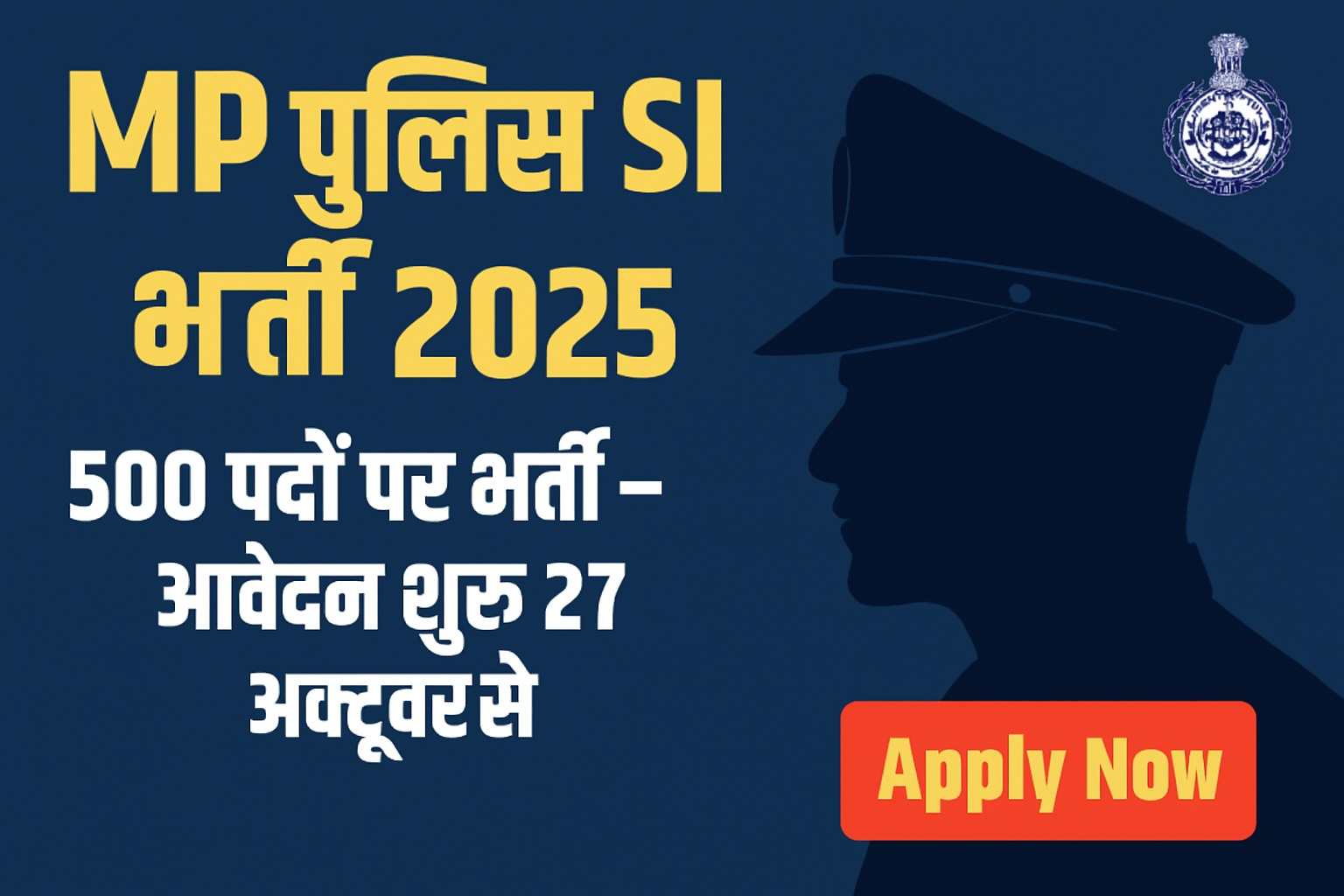 मध्य प्रदेश पुलिस विभाग में लंबे इंतजार के बाद MP Police SI Bharti 2025 का नोटिफिकेशन जारी कर दिया गया है। इस भर्ती के तहत सब-इंस्पेक्टर (SI) और सूबेदार के कुल 500 पदों पर नियुक्तियां की जाएंगी। इच्छुक उम्मीदवार 27 अक्टूबर 2025 से ऑनलाइन आवेदन कर सकेंगे।